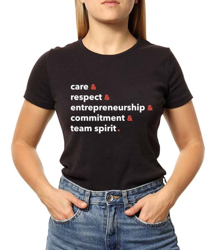 Camiseta em malha algodão preta com valores estampados na frente e logo delaware no verso