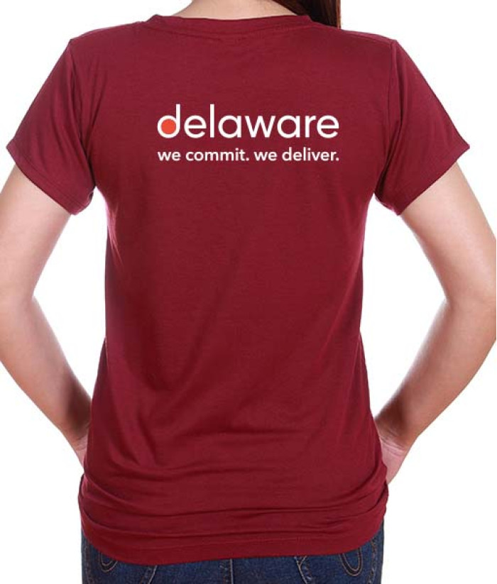Camiseta vermelha em malha algodão personalizada com logo delaware no peito esquerdo, bandeira do Brasil na manga esquerda e aplicação da logo nas costas.